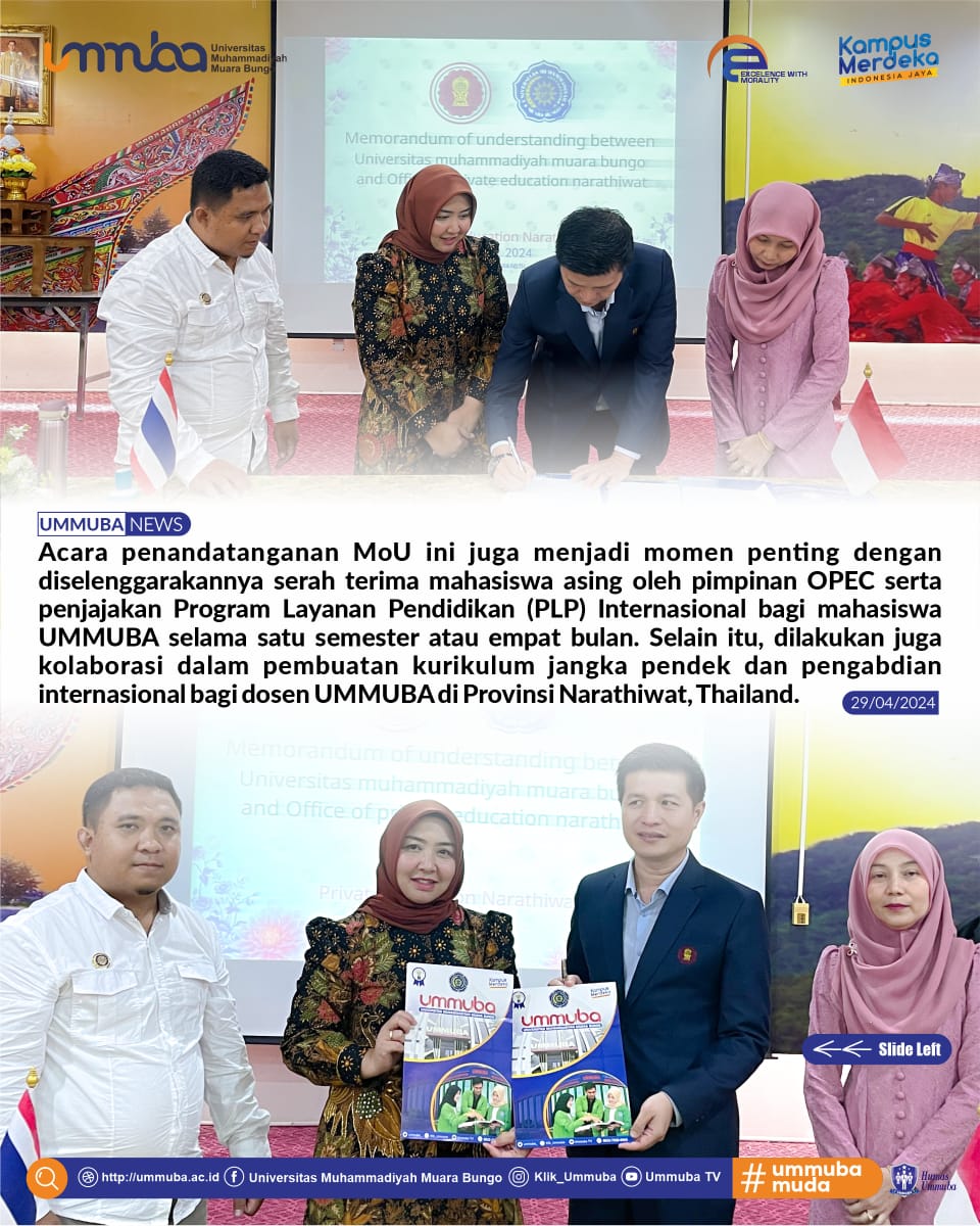 Kami percaya bahwa kolaborasi internasional dan jejaring kerjasama yang kuat akan membuka lebih banyak peluang dan memberikan kontribusi positif dalam mewujudkan visi Universitas Muhammadiyah Muba sebagai universitas yang unggul di tingkat nasional dan internasional.